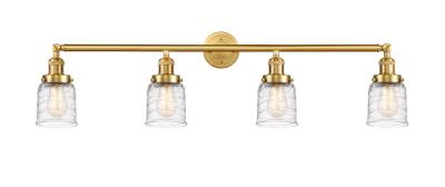 INNOVATIONS 215-SG-G513-LED 4-Light Bath Vanity Light Satin Gold. Collection: Franklin Restoration. Style: Industrial, Farmhouse, Restoration-Vintage, Traditional. Metal Finish: Satin Gold. Metal Finish (Canopy/Backplate): Satin Gold. Material: Steel, Cast Brass, Glass. Dimension(in): 9.75(H) x 42(W) x 7(Ext). Bulb: (4)6W Medium Base,Dimmable(Not Included). Maximum Wattage Per Socket: 100. Voltage: 120. Color Temperature (Kelvin): 2700. CRI: 82. Lumens: 600. Glass Shade Description: Clear Deco Swirl Small Bell. Glass or Metal Shade Color: Deco Swirl. Shade Material: Glass. Glass Type: Transparent. Shade Shape: Bell. Shade Dimension(in): 5(W) x 5.75(H). Fitter Measurement (Glass Or Metal Shade Fitter Size): 3.25 inch Fitter. Canopy Dimension(in): 4.5(Dia). Backplate Dimension(in): 4.5(Dia) x 0.75(Depth). California Proposition 65 Warning Required: Yes. UL & ETL Certification: Damp Location.