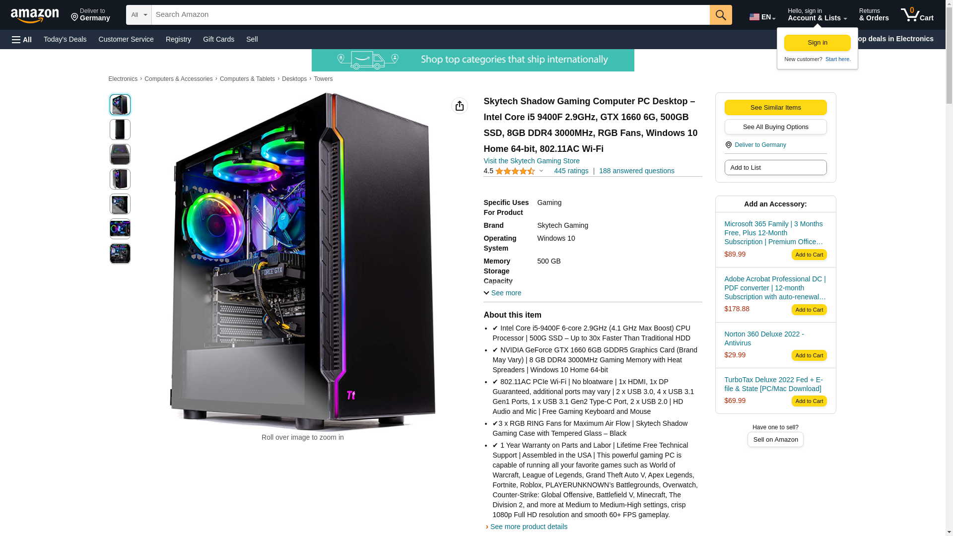 Skytech Shadow Gaming Computer PC Desktop – Intel Core i5 9400F 2.9GHz, GTX 1660 6G, 500GB SSD, 8GB DDR4 3000MHz, RGB Fans, Windows 10 Home 64-bit, 802.11AC Wi-Fi