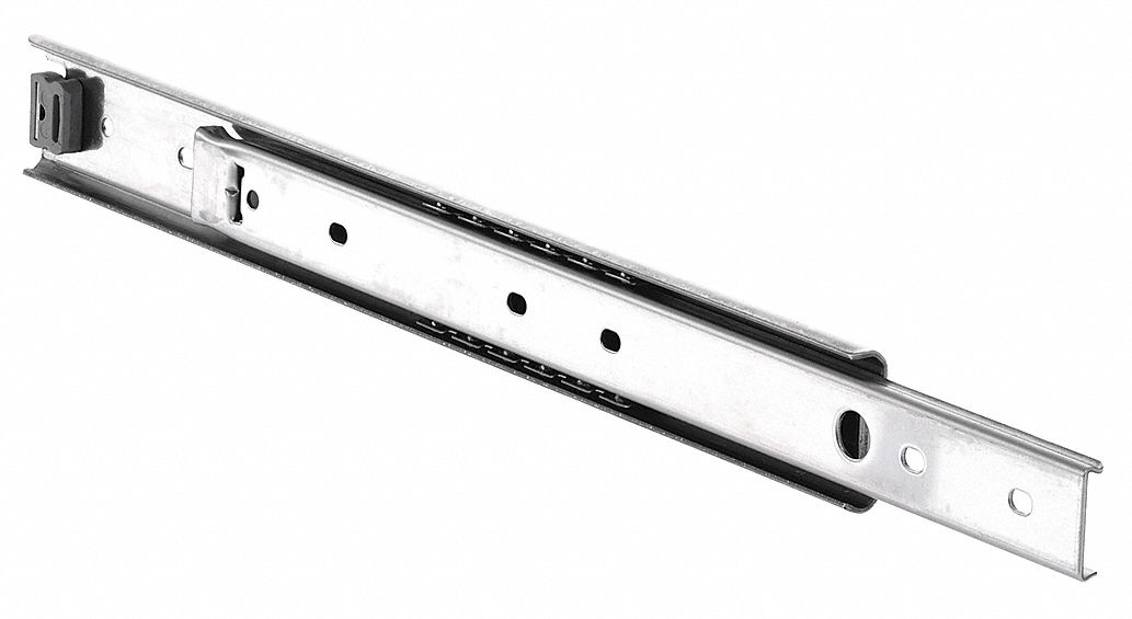 'Drawer Slide, Closure Type Conventional, Mounting Type Side or Hard, Glide Mechanism Ball Bearing, Finish Zinc Plated, Extension Type 3/4 Extension, Disconnect Method Non Disconnect, Closed Length 21-41/64 In., Travel Length 15-33/64 In., Side Mount Load Cap. per Pair 100 lb., Load Capacity 100 lb., Side Space .38+.03/-.00 In., Detent Type Hold-In, Material Stainless Steel, Natural, Package Quantity 2'