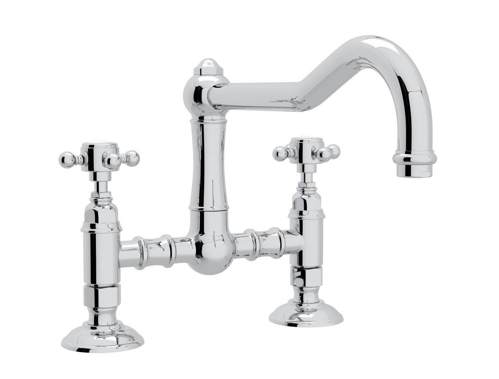 Rohl Chrome Kitchen Cast Spout Faucet A1459XMAPC2. California AB 1953 and Vermont S152 Compliant. 1/4-turn ceramic valves. 8 55/64 reach, swivel spout. 9 17/32 height. 1/2 M supplies. 8 spread. 2.5 GPM flow-rate. Brass construction. Above deck straight union extension is C7205EXT (sold separately). Low flow aerators available (not included). No warranty on Tuscan Brass finish. Type: 2-Hole Deck-Mounted Bridge Kitchen Faucet. Handle(s): (2) cross handles (4-spoke). Available Finishes: Polished Chrome, Polished Nickel, Satin Nickel, Tuscan Brass, Inca Brass (Inca Brass by special order only). Brass Construction: Yes. Swivel Spout: Yes. Hole Installations: 2. 1/4-Turn Ceramic Valves: Yes. 1/2 M Supplies: Yes. AB1953 / S152 Compliant: Yes. Flow Rate: 2.5 GPM. 1 1/2 Straight Union Extensions Available: Yes (not included). Warranty: Limited Lifetime (No warranty on Tuscan Brass Finish - TCB). Spout Reach: 8 55/64. Spout Height: 6 21/32. Faucet Height: 9 17/32. Spread: 8. ROHL This is the ROHL Collection - bringing authentic luxury to the kitchen and bath. Authentic luxury is defined by quality, authenticity, innovation and value. Every faucet, fixture and accessory ROHL offers is designed by acclaimed architects and craftsmen to recreate the provenance, legacy and integrity that is the core of authenticity. Generations of craftsmen have followed the same exacting manufacturing standards to deliver fine quality and performance at an uncompromised value only ROHL can provide. ROHL Country Kitchen Collection No longer will the kitchen sink area be thought of in terms of function at the expense of design. ROHL's collection of Country Kitchen Faucets makes a dramatic statement reflecting your ppreciation of design as well as function in the most used area of the kitchen. Whether it is a renovated Colonial, a faithfully reproduced Tudor, a cottage on the water, a retro ranch or an urban loft. Your ROHL faucet will be as uniquely distinctive as your sense of style. The selection