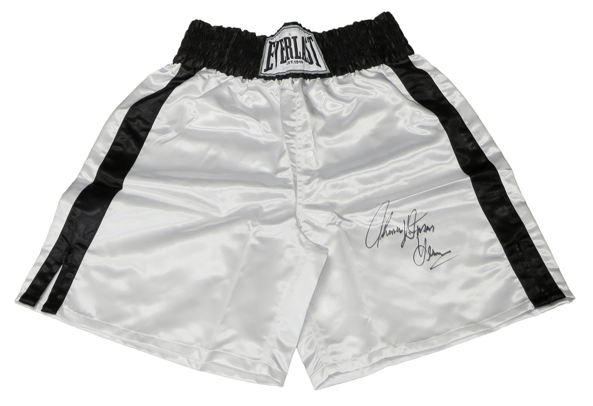 Schwartz Sports Memorabilia HEATRU502 Thomas Hearns Signed Everlast White Boxing Trunks with Hitman