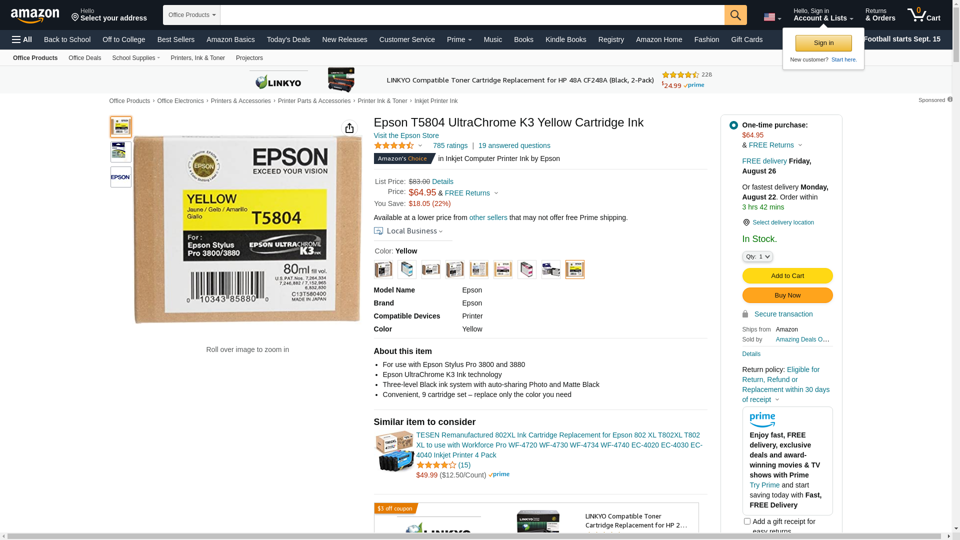 Epson T5804 UltraChrome K3 Yellow Cartridge Ink
