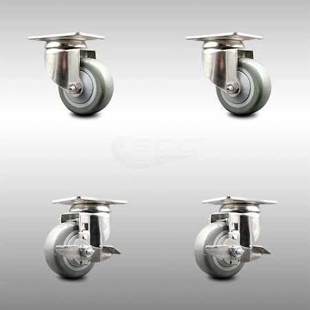 3 Inch 316SS Gray Polyurethane Wheel Swivel Top Plate Caster Brakes SCC, 2PK