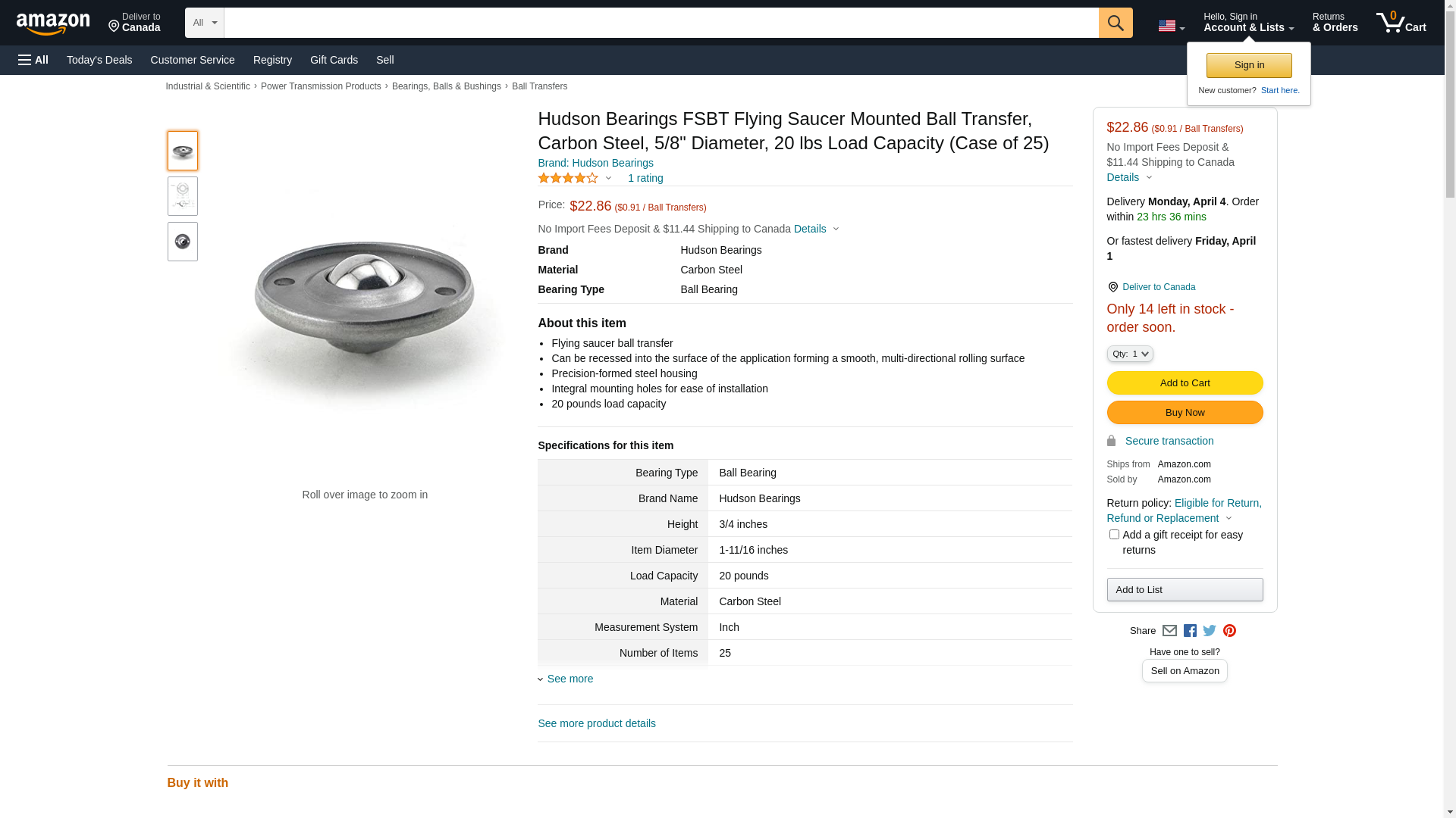 Hudson Bearings FSBT Flying Saucer Mounted Ball Transfer, Carbon Steel, 5/8" Diameter, 20 lbs Load Capacity (Case of 25)