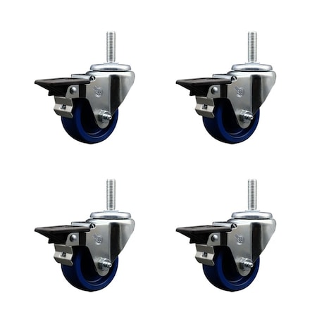 Solid Polyurethane Swivel Threaded Stem Caster Set of 4 w/3" x 1.25" Blue Wheels and 3/4" Stems - Includes 4 with Posi Lock Brakes - 1200 lbs Total Capacity - Service Caster Brand
