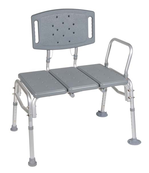 Bariatric Transfer Bench with Backrest is designed for heavier users and features a sturdy, height adjustable aluminum frame that is anti-corrosive and lightweight. The textured, blow molded back and contoured seat provide comfort and support while bathing. The Transfer Bench has an easy to install back support and armrest tube that require no tools for removal or installation. Transfer Bench seat back is reversible to accommodate any bathroom. Bath Transfer Bench has a heavy duty weight capacity of 500 lbs.