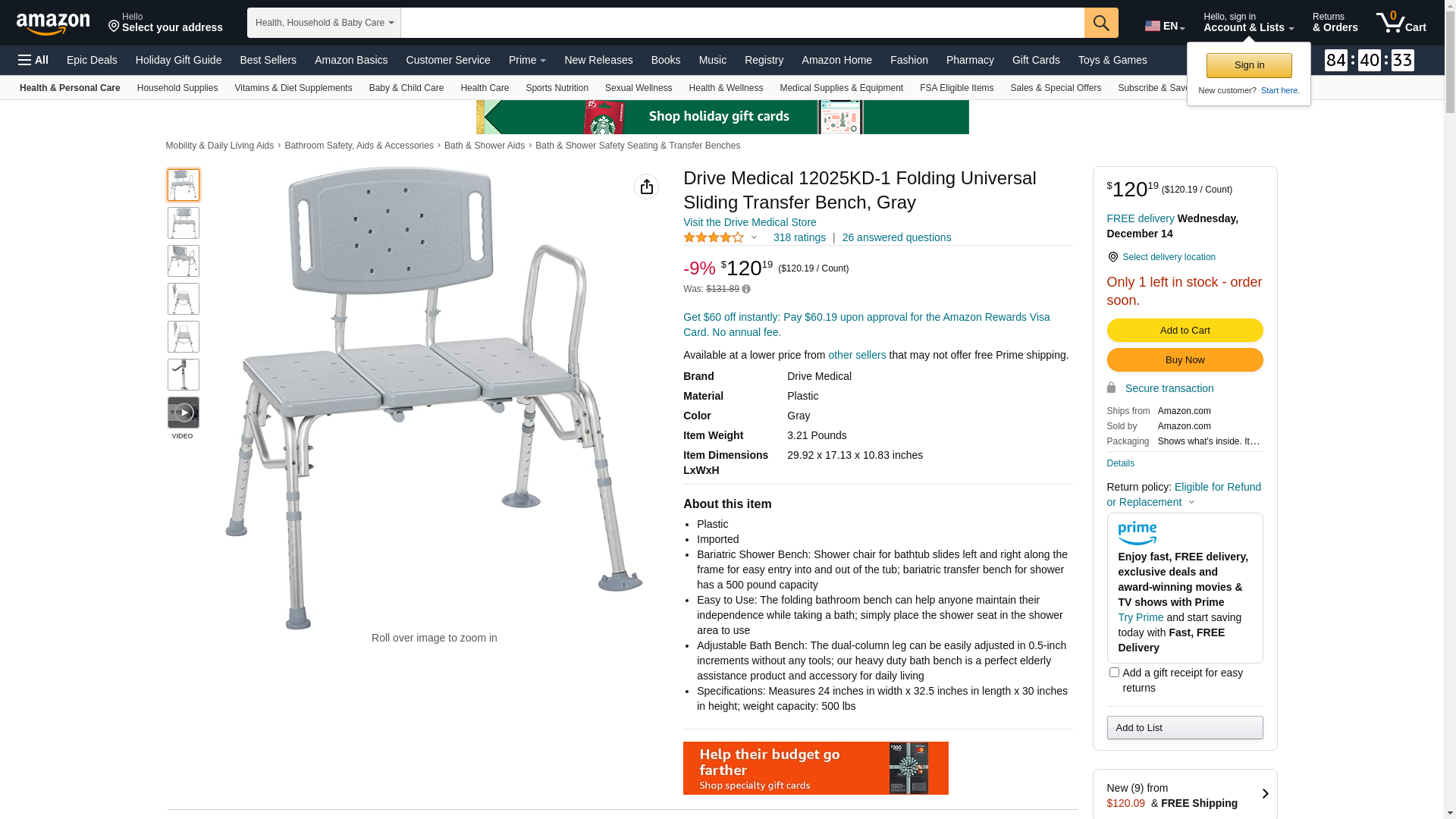 Drive Medical 12025KD-1 Folding Universal Sliding Transfer Bench, Gray