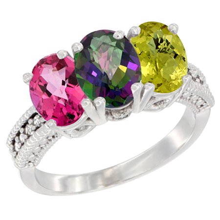 14K White Gold Natural Pink Topaz, Mystic Topaz & Lemon Quartz Ring 3-Stone 7x5 mm Oval Diamond Accent, sizes 5 - 10