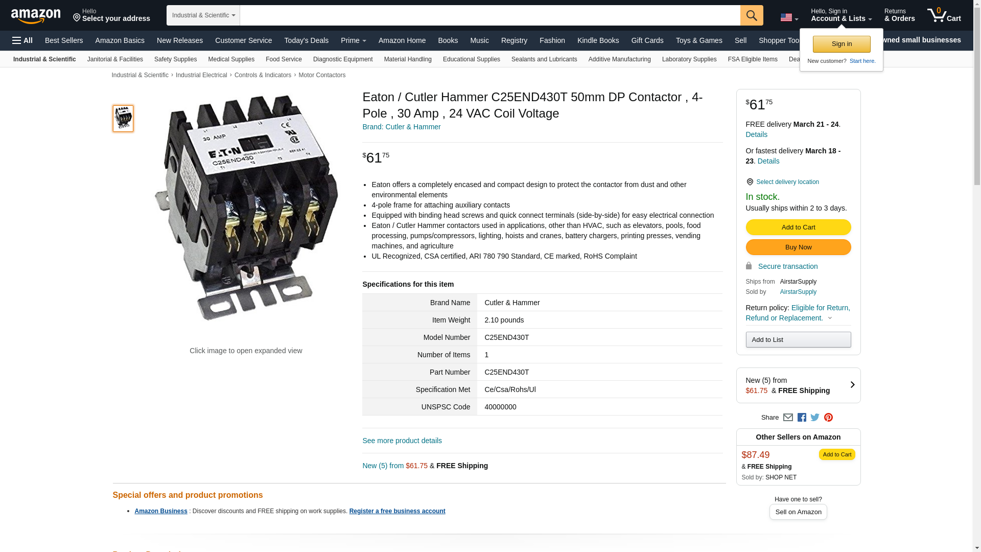 - Eaton C25END430T Dfinit Prpose Contactr,24VAC,30A,4P,Open