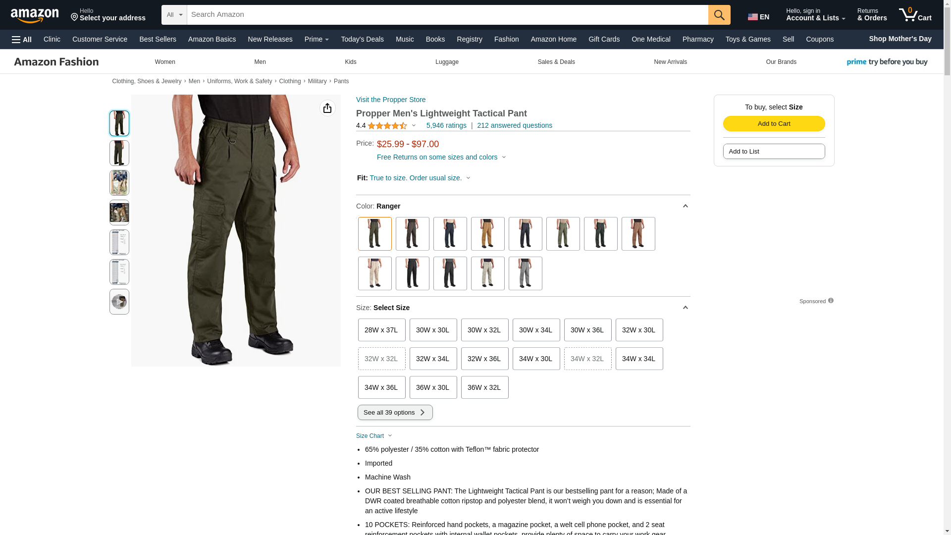 Propper F5252 Ranger Lightweight Tactical Pant 65 % Polyester/35 % Cotton Lightweight Ripstop Ranger 40 in Waist 34 in Length