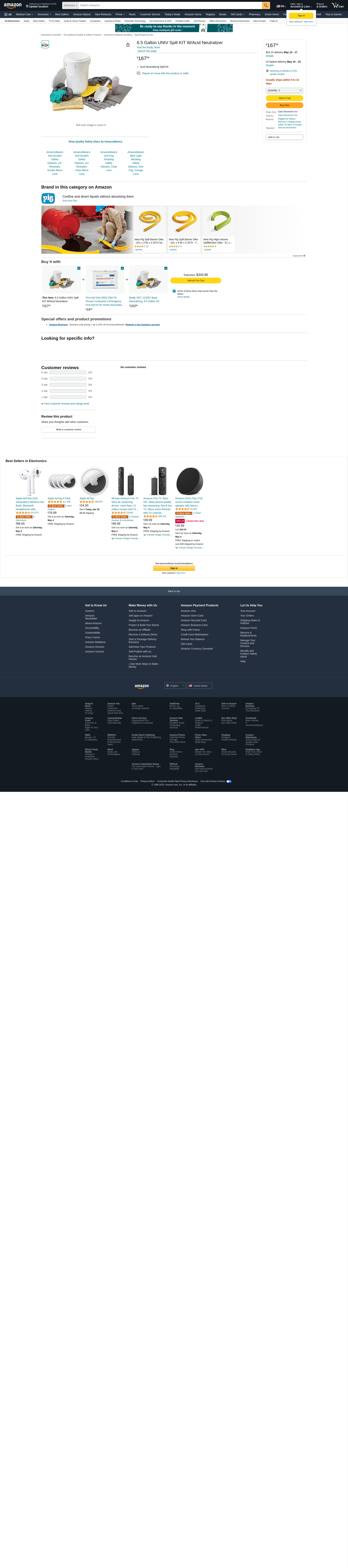 | Feature | <b>Price For:</b> Each <b>Height</b>: 18" <b>Color</b>: white <b>Standards</b>: EPA 40 CFR 112.7(c)(1)(vii); OSHA 29 CFR 1910.120(j)(1)(vii); OSHA 29 CFR 1910.22(a)(2) <b>Includes</b>: (10) 15 x 19" Pads, (2) 3" x 4 ft. SOC\'s, (1) 2 lb. Base Neutralizer Shaker, (1) Pair Goggles, (1) Hazmat Suit, (1) Scoop, (2) Bags, (2) Gloves <b>Item</b>: Spill Kit <b>Volume Absorbed Per Pkg.</b>: 5 gal. <b>Container Type</b>: Bucket <b>Length</b>: 14" |