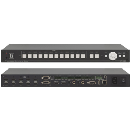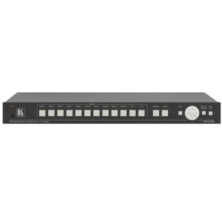 The Kramer <strong>VP-444</strong> is a high-performance presentation scaler/switcher for HDMI and computer graphics signals. The unit scales the video, embeds the audio, and outputs the signal to two HDMI (with embedded audio) outputs (with S/PDIF and balanced stereo audio) simultaneously.</p><p><b>Perfect for:</b><br />Projection systems in conference rooms, boardrooms, classrooms, hotels and churches<br />Home theater up-scaling</p>