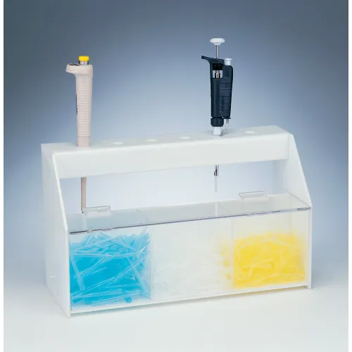 Keep pipettors and tips within reach with this handy storage station. -White acrylic plastic construction -Easy to clean -Transparent acrylic lid for easy visibility The top rack stores up to six pipettors, and the three bins hold a generous supply of bulk pipettor tips. White acrylic plastic base, sides, and top allow for easy cleaning. Bin front and self closing lid are made from transparent acrylic for clear view of contents.