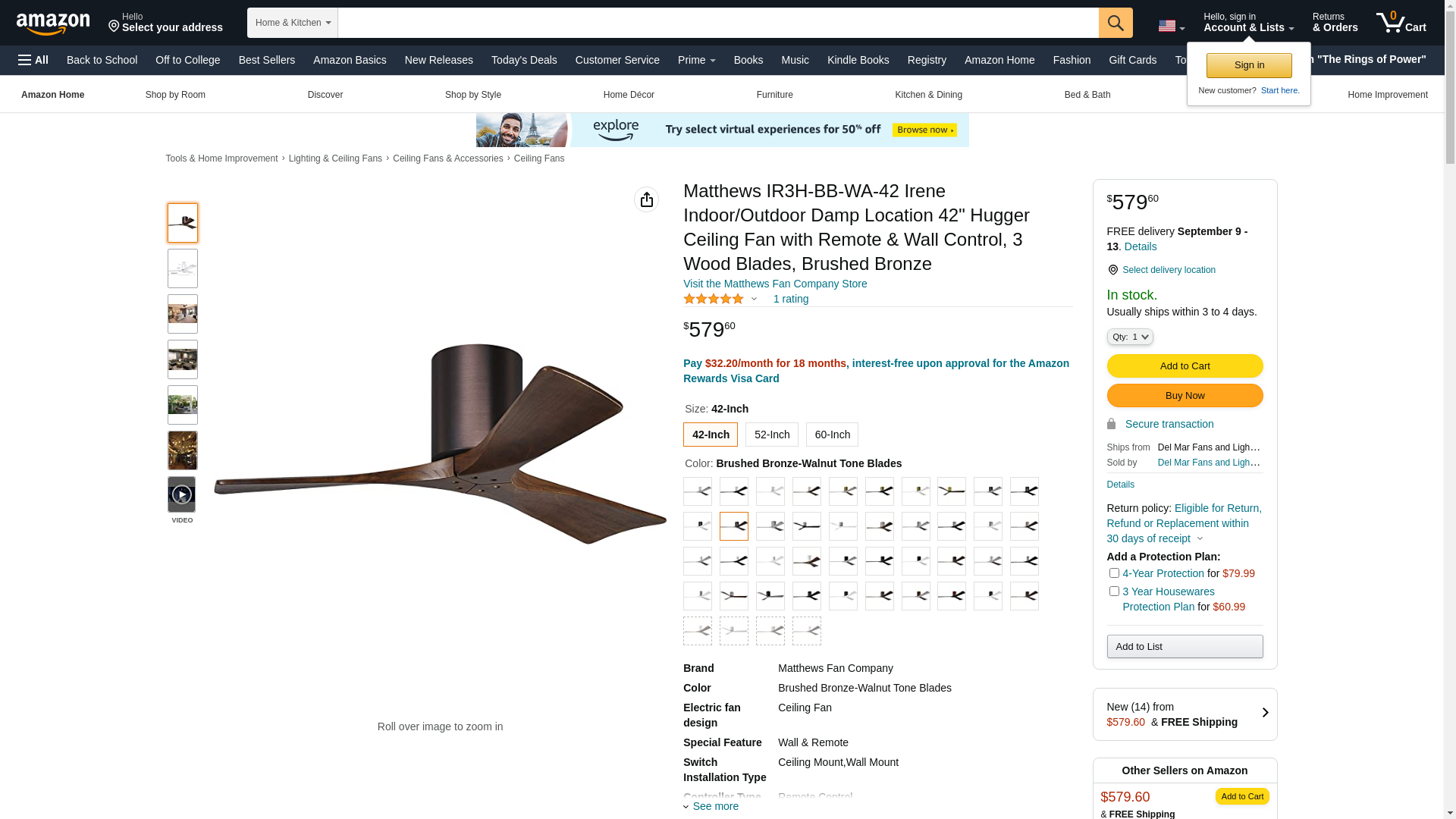 Buy Matthews Fan IR3H-BB-WA-42 42-in 17W Irene Ceiling Fan, DC, 6-Speed, 3-Walnut Blades, Brushed Bronze on HomElectrical.com. Take advantage of FREE SHIPPING.
