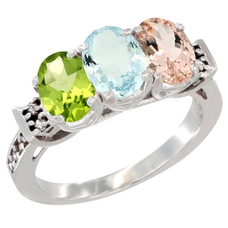 10K White Gold Natural Peridot, Aquamarine & Morganite Ring 3-Stone Oval 7x5 mm Diamond Accent, sizes 5 - 10