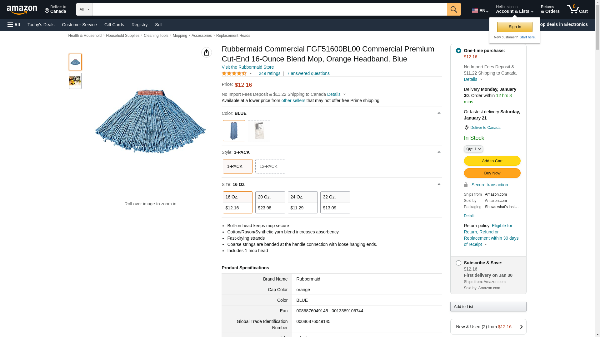 | Feature | Cotton/synthetic Cut-End Blend Mop Head, 16oz, 1" Band, Blue, 12/carton |