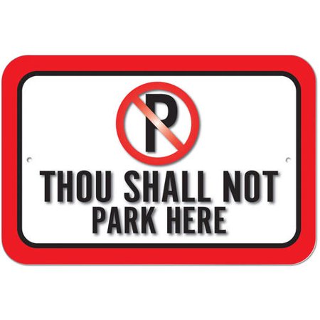 <br /> <b>Thou Shall Not Park Here Sign:</b> <ul> <li>9" x 6" aluminum indoor/outdoor sign</li> <li>Printed with UV resistant inks for durability</li> <li>Pre-drilled holes for mounting</li> </ul>