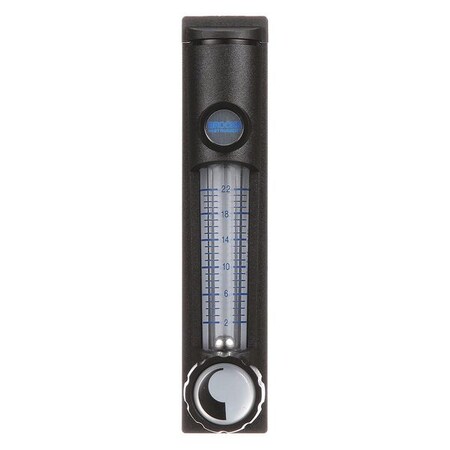 ' Flowmeter, Variable Area, Max Pressure 100 PSI, Connection Size (In) 1/8 FNPT, Max Temp 150 F, Housing Material Polycarbonate, Chamber Material Polycarbonate, Flow Range @ SCFH of Air 1-22, Max Viscosity 16.4 CST, Stainless Steel Fitting, Viton O-Ring, Accuracy +/-4 % '