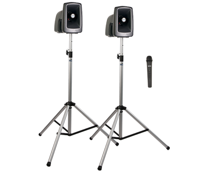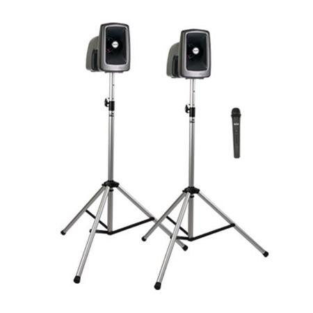 Megavox deluxe air package 1 includes mega2-xu2, mega2-air, two ss-550, and choice of one wireless handheld mic or headband and lapel mic with belt pack