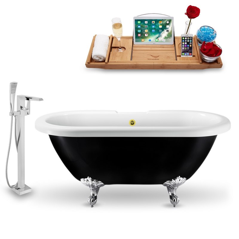 STREAMLINE NH1120CH-GLD-100 59 INCH CLAWFOOT TUB IN GLOSSY BLACK WITH FAUCET, DRAIN IN POLISHED GOLD, POLISHED CHROME...