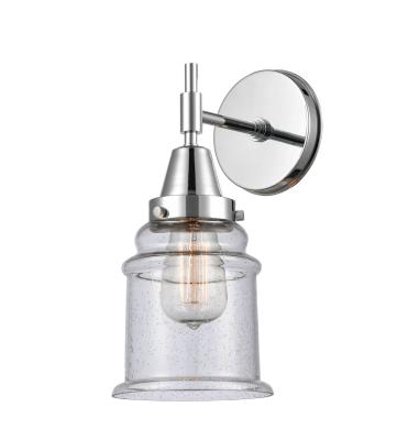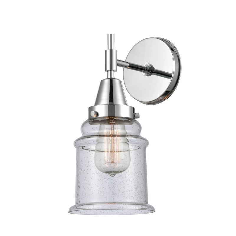 INNOVATIONS LIGHTING 447-1W-PC-G184-LED Caden Sconce. Innovations Lighting Caden 1 Light 13 inch Polished Chrome Sconce. Material: Steel, Glass. Metal Finish(Body): Polished Chrome. Metal Finish (Canopy/Backplate): Polished Chrome. Dimension(in): 12.5(H) x 6(W) x 8.25(Ext). Maximum Wattage Per Socket: 100. Bulb: (1)3.5 Watt LED Vintage Medium Base Bulb Included. Dimmable: Yes. Color Temperature(Kelvin): 2700. Lumens: 350. Color Rendering Index(CRI): 82. Voltage: 120. Glass Shade Description: Seedy Large Cone. Glass Type: Seeded. Glass or Metal Shade Shape: Cone. Glass or Metal Shade Color: Seedy. Shade Material: Glass. Shade Size (Diameter x Height)(in): 6 X 7.25. Shade Fitter Measurement(in): 3.25 inch Fitter. Backplate Dimensions(in): 5.25 X 0.875. Duo Mount: No. Certification: UL & ETL, Damp Location. Sharp lines and dramatic styling.