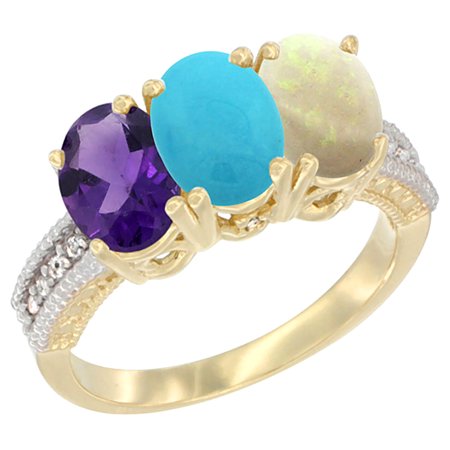 14K Yellow Gold Natural Amethyst, Turquoise & Opal Ring 3-Stone 7x5 mm Oval Diamond Accent, sizes 5 - 10