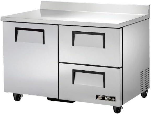 True 2-Drawer 2-Shelf S/S Deep Worktop 12 Cu Ft RefrigeratorTrue dual purpose worktop refrigerators keep foods cold and provide an extra working surface in your kitchen. The one-piece stainless steel worktop does not have creases where food and bacteria can get trapped. The environmentally friendly refrigeration system provides 360° circular airflow for even cooling. Stainless steel, self-closing, swing doors have a 90° stay open feature.Benefits and Features:heavy duty stainless steel and aluminum Ecomate insulation Zero ozone depletion (ODP), zero global warming potential (GWP) CFC free 134A refrigerant Refrigeration system holds temperatures between 33° to 38°F Self-lubricating evaporator fan motor Condensing unit accessible from rear Door locks standard Additional Information:1 door, 2 drawer, and 2 PVC coated shelves Width: 48-3/8" Depth: 30-1/8" Height: 33-3/8" Ship Weight: 315 lbs Capacity: 12 cubic ft 1/5 HP, 5 Amps Unit is pre-wired for 115/60/1 phase, 5-15P plug 5-Year condenser warranty 3-Year parts/labor warranty Made in the USA NSF, CSA, CUL, and UL Listed Model #: TWT-48D-2 579240