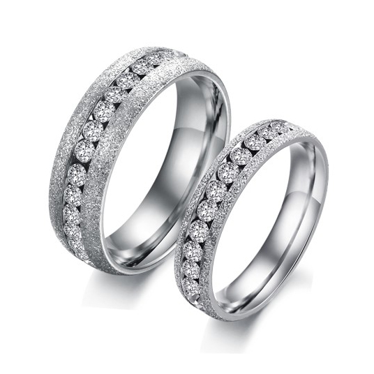 CET Domain SZ17-R142M-7 Titanium Steel Silver Frosted Cubic Zirconia Crystal Couple Rings- Men-Size 7