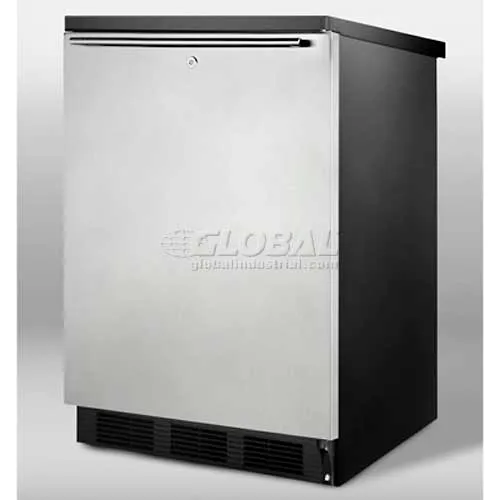 Summit Appliance FF7LBLKSSHH Accucold 24" Wide Freestanding All-Refrigerator, 5.5 cu.ft. Storage Capacity, Factory Lock, Automatic Defrost, Adjustable Shelves, Fully Finished Cabinet<br><br> Key Features<br> - Commercially approved for use in food-service establishments<br> - Factory-installed lock provides security you can count on<br> - Stainless steel door complete with stylish horizontal handle<br> - Automatic defrost minimizes user maintenance<br> - Includes adjustable glass shelves for flexible storage<br> - Full 5.5 cu.ft. capacity inside a convenient 24" footprint<br> - Made in Europe<br><br> Specifications<br> - Height of Cabinet: 33.5"<br> - Width: 23.63"<br> - Depth: 23.5"<br> - Depth with Handle: 25.13"<br> - Depth with door at 90 degrees: 46.0"<br> - Capacity: 5.5 cu.ft<br> - Defrost Type: Automatic<br> - Door: Stainless Steel<br> - Cabinet: Black<br> - US Electrical Safety: ETL<br> - Canadian Electrical Safety: ETL-C<br> - Sanitation: ETL-S<br> - Amps: 0.9<br> - Voltage/Frequency: 115 V AC/60 Hz<br> - Door Swing: RHD<br> - Reversible: Yes<br> - Shelf Type: Glass<br> - Shelf Qty: 3<br> - Adjustable Shelves: Yes<br> - Thermostat Type: Dial<br> - Fan Type: Exterior<br> - Refrigerant Type: R600a<br> - Refrigerant Amount: 0.64 oz<br> - High Side PSI: 180.0<br> - Low Side PSI: 80.0<br> - Level Legs Qty: 4<br> - Interior Light: Yes<br> - Interior Height: 27.75"<br> - Interior Width: 20.0"<br> - Interior Depth: 17.5"<br> - Compressor Step Height: 7.0"<br> - Compressor Step Width: 20.0"<br> - Compressor Step Depth: 6.0"<br> - Dimensions (HxWxD): 33.5" x 23.63" x 23.5"<br> - Weight: 100 lbs<br><br>