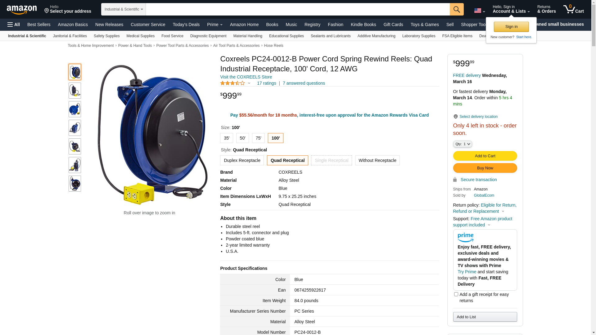 A uniquely compact variant of our LG (Little Giant) series, the Coxreels PC24-0012-B Compact Efficient Heavy Duty Power Cord Reel is perfect for small spaces. Ideal for industrial and commercial shops as well as home garages, the single pedestal spring-driven cord reel can be mounted on floors, workbenches, overhead spaces, and walls with the help of the guide arm. The reel includes a 100 foot electrical cable, grounding plug, and a 5’ lead cable to ensure your cord stays smooth and unpinched while in use. The ratchet hub is non-corrosive and high strength, with self lubricating precision bearings. Product measures at 24" x 10.25" x 25.5” and weighs 84 pounds. Safe and strong for users, CNC spun discs have rolled edges that are spun and ribbed robotically. Proudly made in the USA and offering support worldwide.