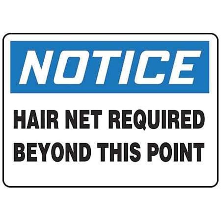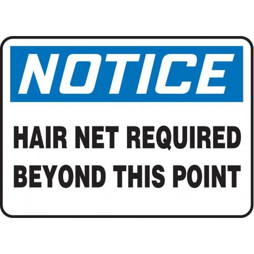 OSHA Safety Signs - NOTICE: Hair Net Required Beyond This Point, 50% Recycled Plastic, 10" x 14". Plastic signs combine standard, reliable performance with 92% recycled content to create a dependable, Earth-friendly material. Contains 50% recycled content, and very easily recyclable (Code 2) unlike competitor signs made of polystyrene (Code 6). Any recycling center will accept it. The .055" thick polyethylene, matte surface with resist impacts and offers slight flexibility. <br>Rounded corners and 3/16" mounting holes on most sizes. <br>Service temperature range is -90F to 168F.