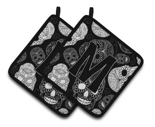 Carolines Treasures CJ2008-MPTHD Letter M Day of the Dead Skulls Black Pair of Pot Holders, 7.5 x 3 x 7.5 in.