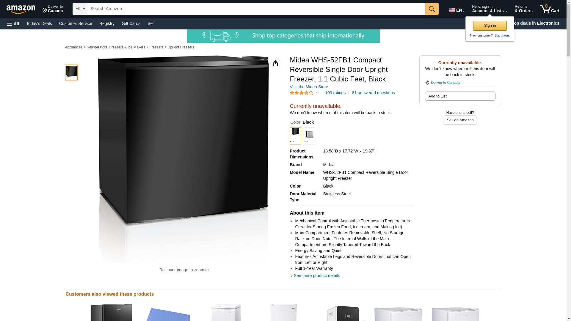 Midea WHS-52FB1 Compact Single Reversible Door Upright Freezer, 1.1 Cubic Feet, Black