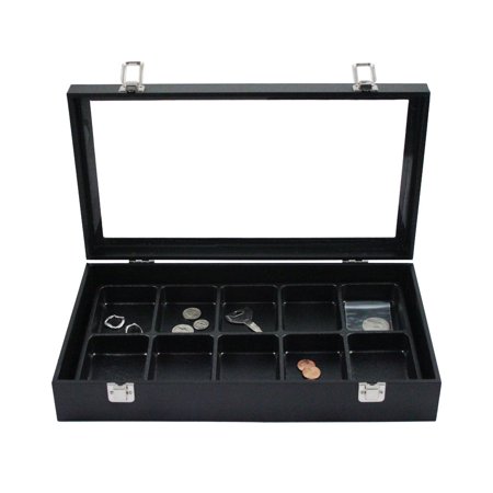 <ul> <li>Display Box Dimensions: 14.5" x 8 1/8" x 3"</li> <li>Glass Top Jewelry Box</li> <li>Material: Black Painted Wood</li> <li>Metal Latches & Hinges</li> <li>Liner Tray Dimensions: 13 3/4? x 7 5/8?</li> </ul>