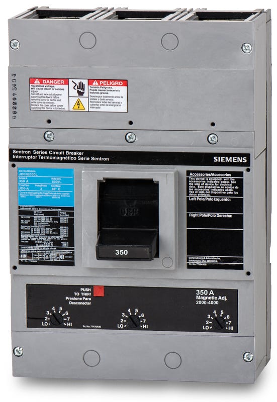Molded Case; Jd Frame; 600 Vac, 500 Vdc; 350 Ampere; 3 Pole; Interrupting Rating 65 Kiloampere At 240 Vac, 35 Kiloampere At 480 Vac, 25 Kiloampere At 600 Vac, 30 Kiloampere At 250 Vdc, 25 Kiloampere At 500 Vdc (ul), 65 Kiloampere At 220 To 240 Vac, 40 Kiloampere At 380 To 415 Vac, 30 Kiloampere At 500 Vac (iec); Terminal Lug; Size 7.5 Inch W X 5.44 Inch D X 11 Inch H