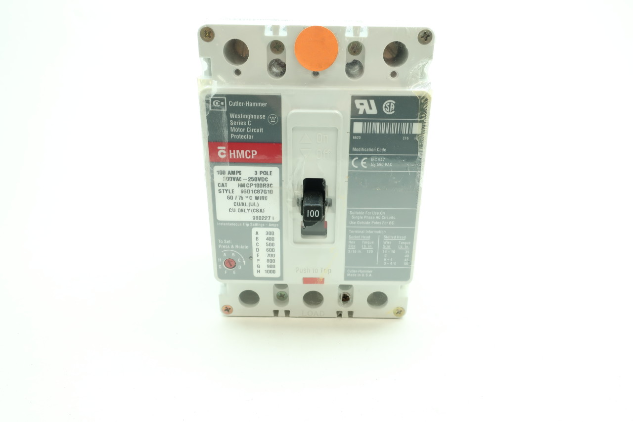 Westinghouse<br>Cutler-Hammer / Eaton<br> Cat No. HMCP100R3C<br><br> Series C Motor Circuit Protector<BR> 100 Amps<BR> Type HMCP<br><br>Includes sets of bottom & top lugs<br> Has a glossy gray & red label<BR><BR> 3 Pole<BR> 480/600 VAC<br> 250 VDC<BR><br> Instantaneous Trip Settings:<BR> 300-1000 Amps<BR><BR><BR> Breaker Weight: 4 lbs.<br> Breaker Dimensions (D x W x H): 4" x 4" x 6"