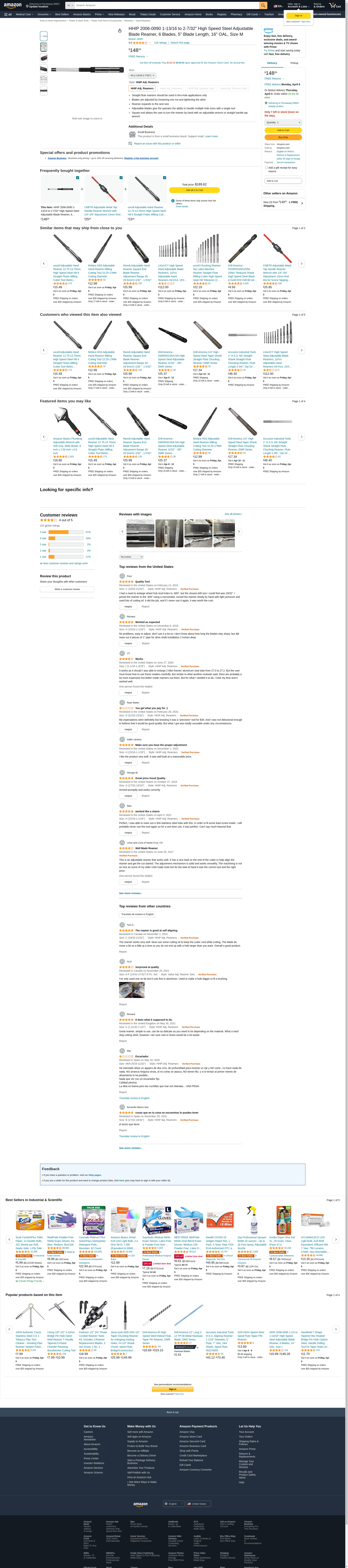 HHIP 2006-0090 1-13/16 to 2-7/32" High Speed Steel Adjustable Blade Reamer, 6 Blades, 5" Blade Length, 16" OAL, Size M