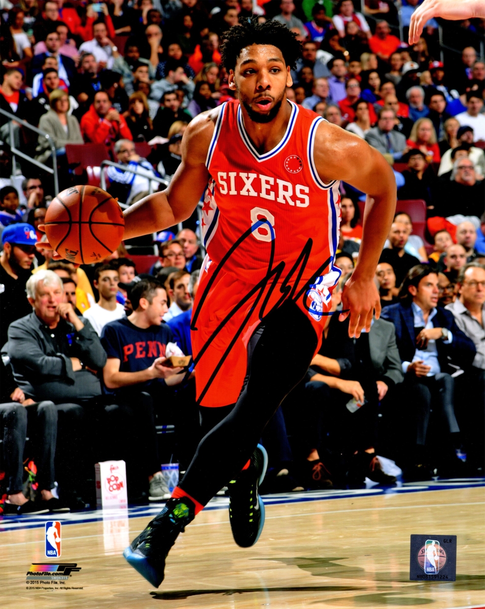 Schwartz Sports Memorabilia OKA08P214 8 x 10 in. Jahlil Okafor Signed Philadelphia 76ers Red Jersey Dribbling Photo