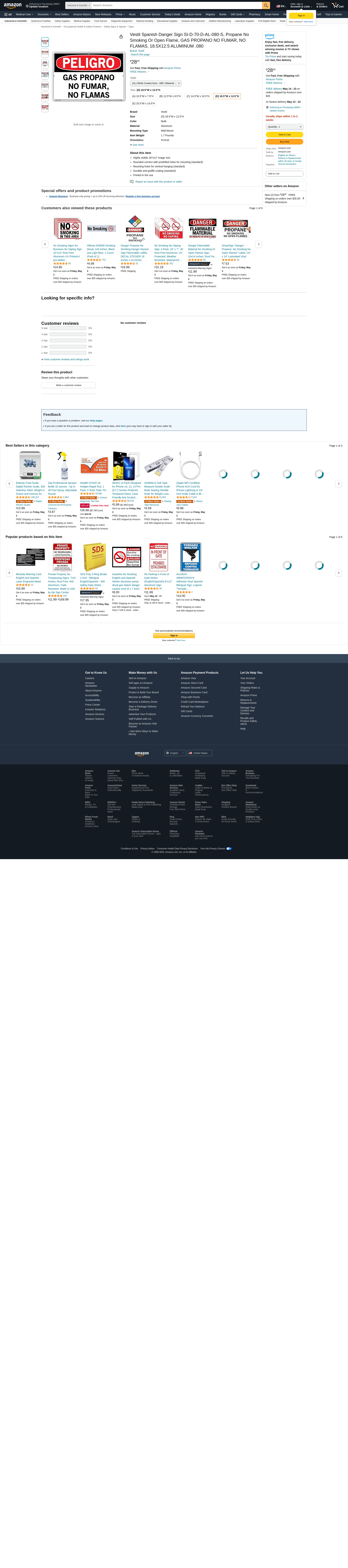 Vestil Spanish Danger Sign SI-D-70-D-AL-080-S, Propane No Smoking Or Open Flame, GAS PROPANO NO FUMAR, NO FLAMAS, 18.5X12.5 ALUMINUM .080