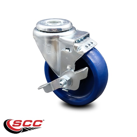 Solid Polyurethane Swivel Bolt Hole Caster w/4" x 1.25" Blue Wheel & Top Locking Brake - 300 lbs Capacity/Caster - Service Caster Brand