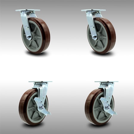 Stainless Steel Polyurethane on Polyolefin Swivel Top Plate Caster Set of 4 w/8" x 2" Maroon Wheels - Includes 2 Swivel with Brakes & 2 Swivel - 4000 lbs Total Capacity - Service Caster Brand