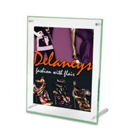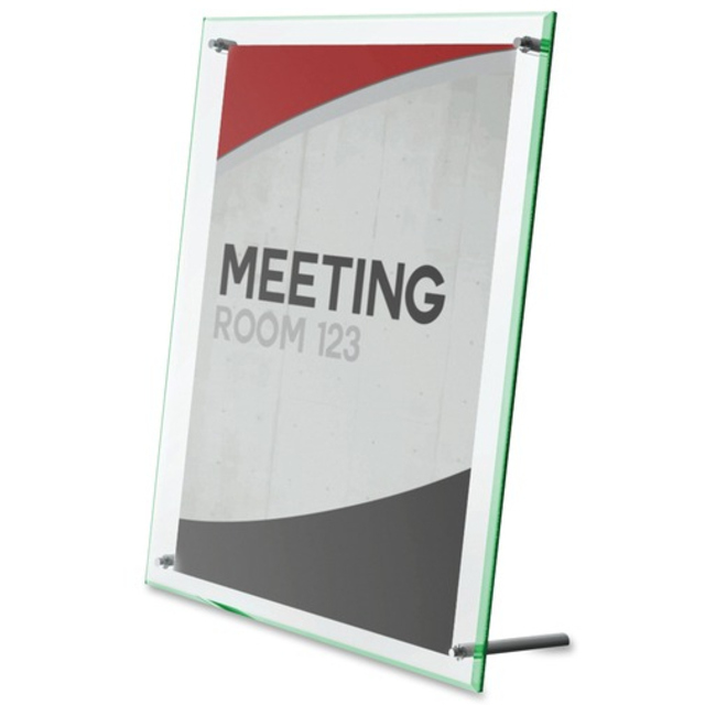 Sleek and sophisticated with green tinted edges and silver knob base. Slanted for easy viewing. Reposition base knobs to accommodate vertical or horizontal signage.