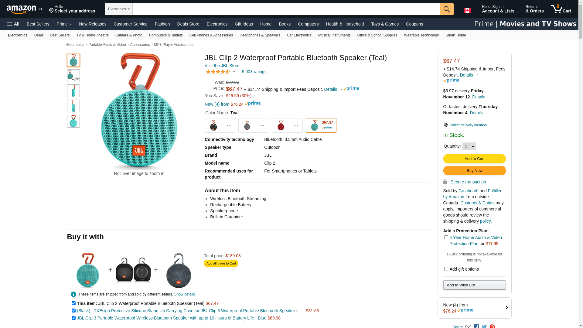 JBL Clip 2 Waterproof Portable Bluetooth Speaker (Teal)