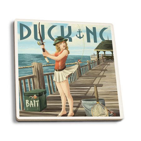 Lantern Press Duck, North Carolina - Pinup Girl Fishing (Set of 4 Ceramic Coasters - Cork-Backed, Absorbent)