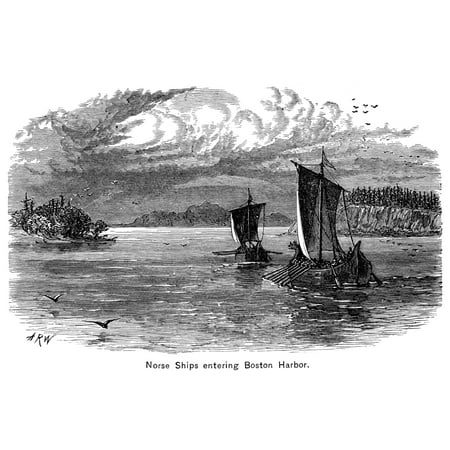Stretched Canvas Art - Vikings: North America. /Nnorse Ships Entering Boston Harbor. Wood Engraving, American, 19Th Century. - Large 24 x 36 inch Wall Art Decor Size.