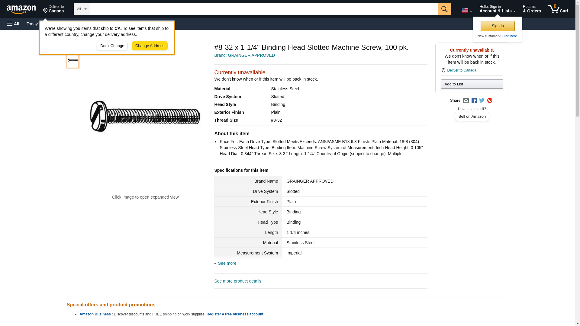 | Feature | Price For: Each Drive Type: Slotted Meets/Exceeds: ANSI/ASME B18.6.3 Finish: Plain Material: 18-8 (304) Stainless Steel Head Type: Binding Item: Machine Screw System of Measurement: Inch Head Height: 0.105" Head Dia.: 0.344" Thread Size: 8-32 Length: 1-1/4" Country of Origin (subject to change): Multiple |