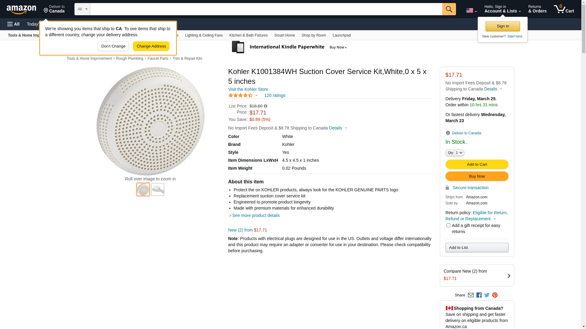 Kohler K1001384WH Suction Cover Service Kit,White,0 x 5 x 5 inches (1001384-0)
