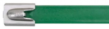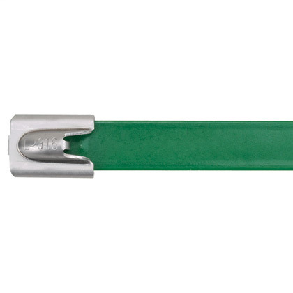 These retained-tension ties are engineered for mechanical application of rigid materials.<br /><br /> Item: Cable Tie<br /> Length - Cable Tie: 14.30"<br /> Approximate Length - Cable Tie: 14-1/2"<br /> Indoor/Outdoor: Indoor,Outdoor<br /> Temp. Range: -40 Degrees to 302 Degrees F<br /> Locking Style: Ball Lock<br /> Width - Cable Tie: 0.31"<br /> Thickness: 0.01"<br /> Tensile Strength - Cable Tie: 250 lb.<br /> Max. Bundle Dia.: 4.00"<br /> Color - Cable Tie: Green<br /> Material: 316 Stainless Steel<br /> Basic Material - Cable Tie: Metal<br /> Design - Cable Tie: Standard<br /> Resists: Corrosion,UV<br /> Tool Code: G/H<br /> Metal Detectable: Yes<br /> Standards: UL2043, RoHS Compliant<br /> Cable Tie Duty: Extra Heavy Duty<br />