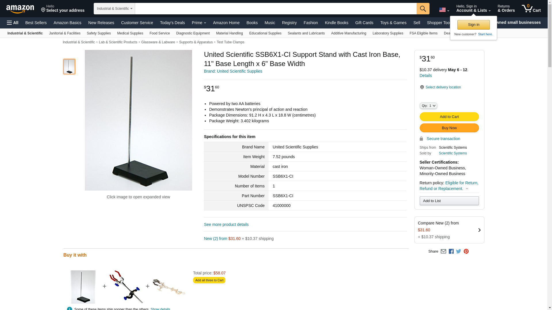 | Feature | UNITSCI - SUPPORT STAND W/ ROD, CAST IRON, 6" X 11" BASE w/ 36" ROD, EA1 |