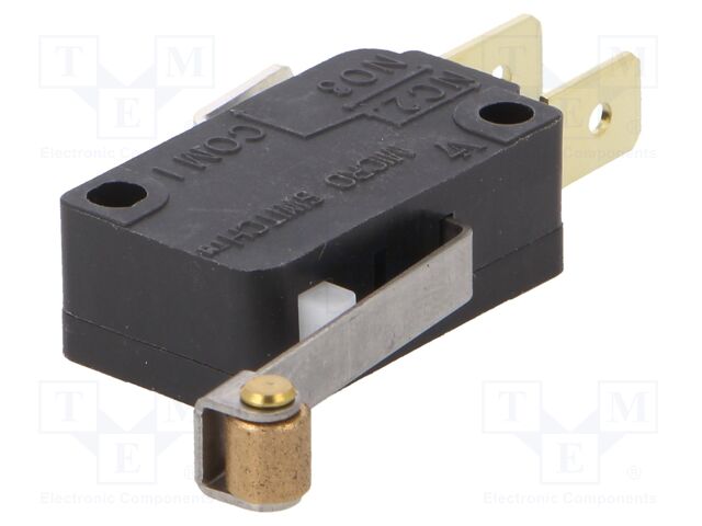 V7 Series Miniature Basic Switch, Single Pole Double Throw Circuitry, 15 A at 277 Vac, Roller Lever Actuator, 0,84 N [3.0 oz] Maximum Operating Force, Silver Contacts, Quick Connect Termination